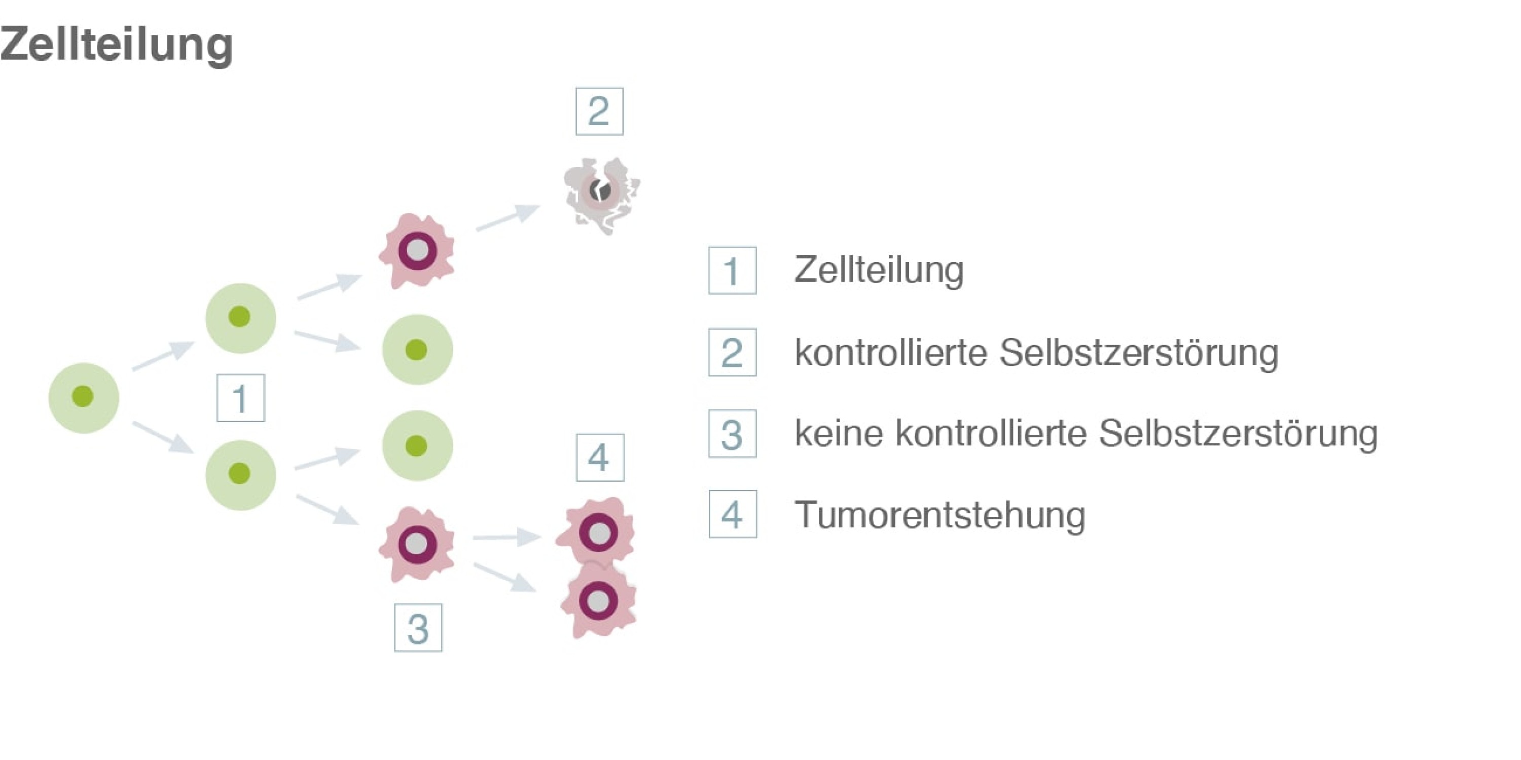 Hier findet diese kontrollierte Selbstzerstörung nicht statt. Die potenziellen Krebszellen können sich ungehindert weiter teilen und vermehren.