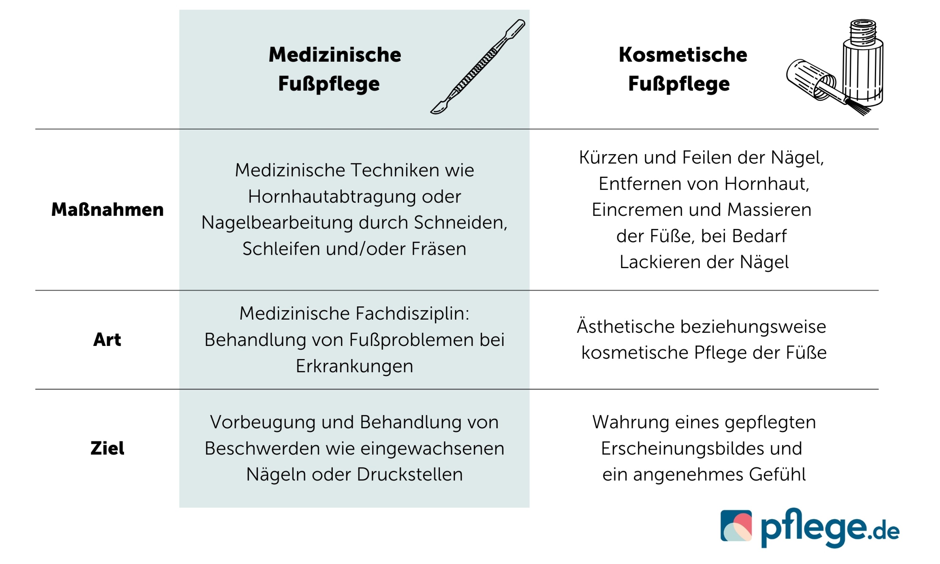 Die kosmetische Fußpflege befasst sich mit der Pflege und dem ästhetischen Erscheinungsbild der Füße, beispielsweise durch Pediküre oder Nagellack. Die medizinische Fußpflege hingegen behandelt krankhafte Veränderungen wie eingewachsene Nägel, Hornhautprobleme oder Pilzinfektionen und dient der Gesundheitsvorsorge.