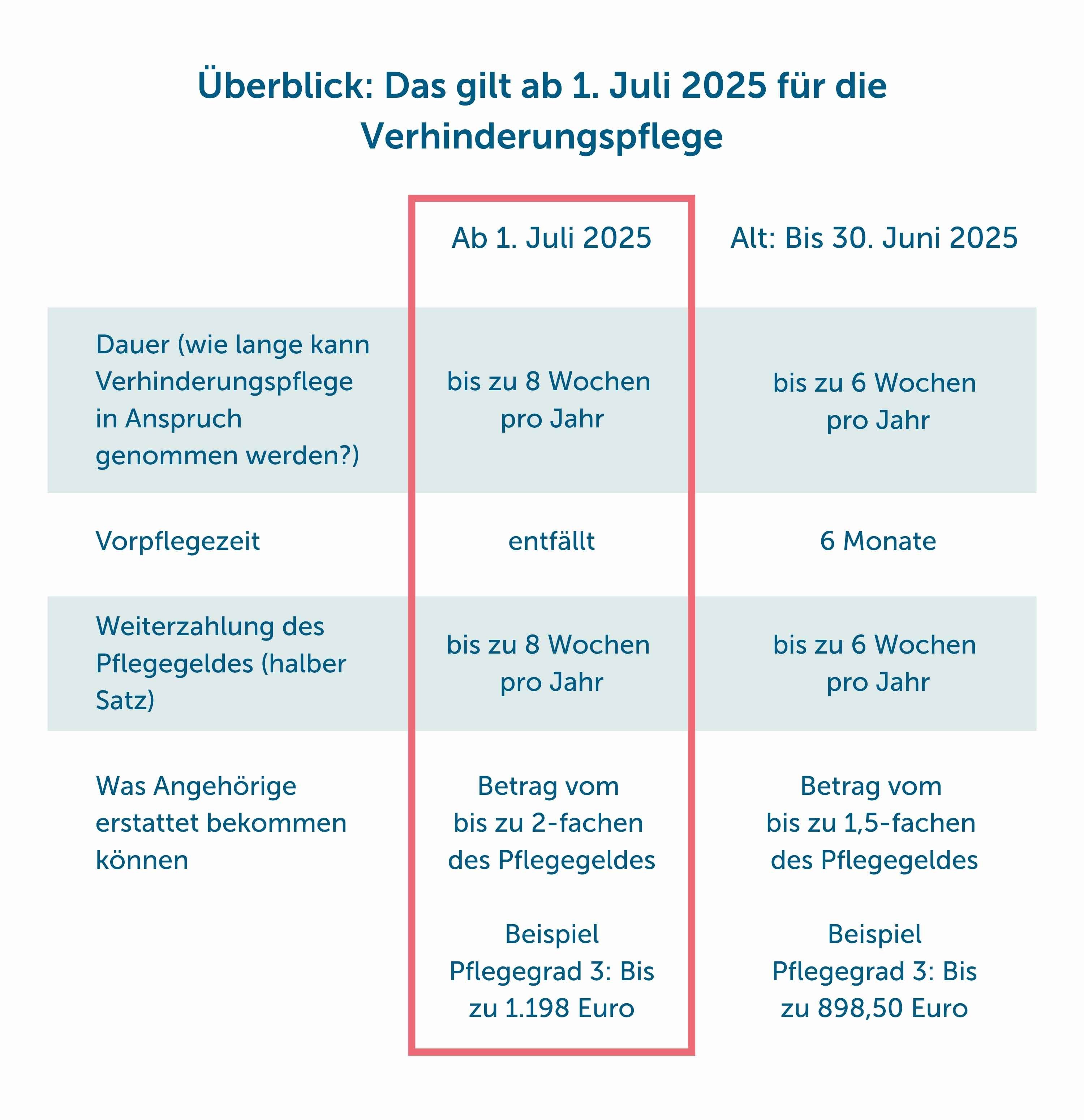 Um gleiche Bedingungen zu schaffen, werden die Voraussetzungen der Verhinderungspflege an die der Kurzzeitpflege angeglichen. (1)  Das bedeutet: