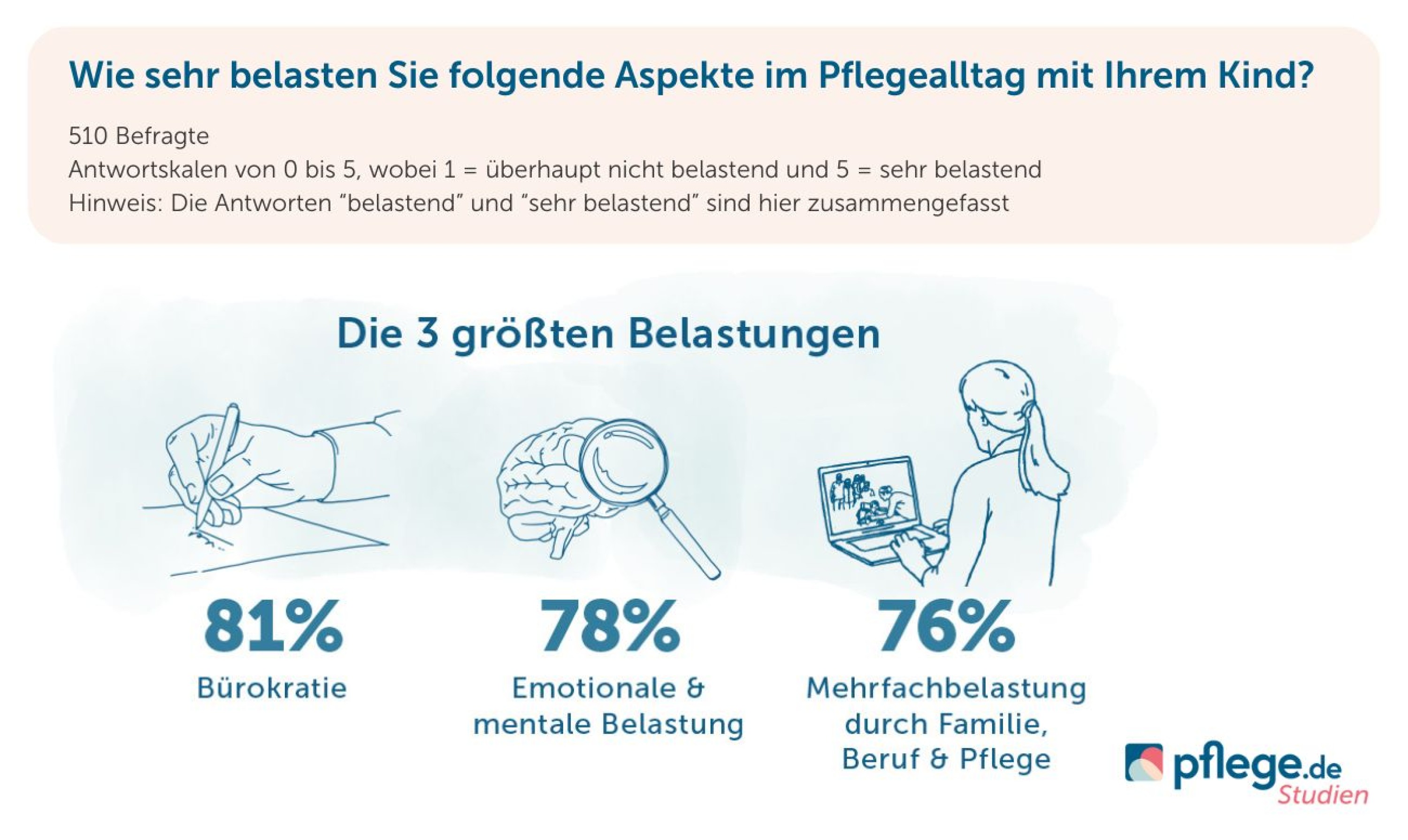 Bei den Befragten ist die Bürokratie mit 81 Prozent die größte Belastung im Kinderpflegealltag. Dicht gefolgt von der emotionalen und mentalen Belastung (78 Prozent), die mit einer Pflegebedürftigkeit des eigenen Kindes einhergeht. Die drittgrößte Belastung ist für die Befragten der Anspruch, Familie, Beruf und die Pflege des Kindes zu vereinbaren (76 Prozent).